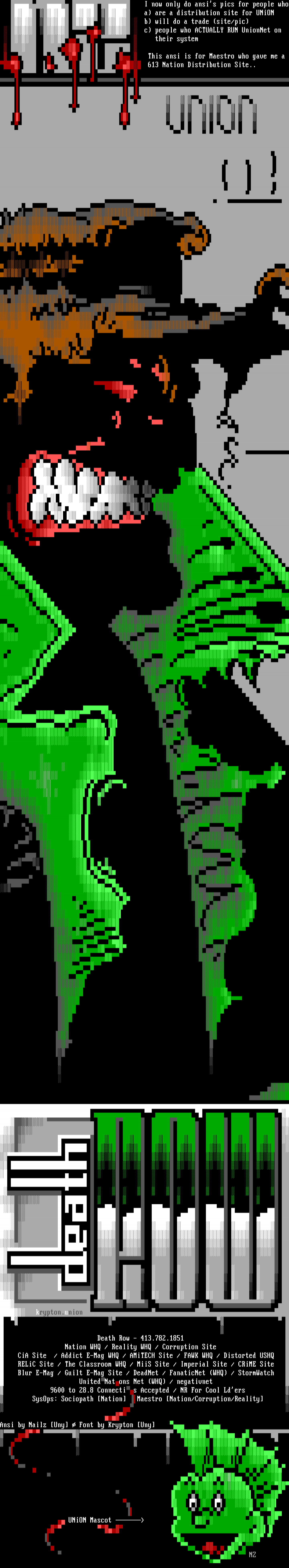 krypton.union Death Row - 413.782.1851 Nation WHQ / Reality WHQ / Corruption Site CiA Site / Addict E-Mag WHQ / AMiTECH Site / FAWK WHQ / Distorted USHQ RELiC Site / The Classroom WHQ / MiiS Site / Imperial Site / CRiME Site Blur E-Mag / Guilt E-Mag Site / DeadNet / FanaticNet WHQ / StormWatch UnitedNatons Net WHQ / negativnet 9600 to 28.8 Connectis Accepted / NR For Cool Lders SysOps: Sociopath Nation Maestro Nation/Corruption/Reality