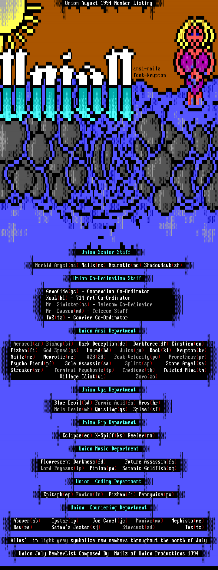 Union Senior Staff Morbid Angelma Nailznz Neuroticnc ShadowHawksh Union Co-Ordination Staff GenoCidegc - Compendium Co-Ordinator KooLkl - 714 Art Co-Ordinator Mr. Sinisterms - Telecom Co-Ordinator Mr. Dawsonmd - Telecom Staff TaZtz - Courier Co-Ordinator Union Ansi Department Aerosolar Bishopbi Dark Deceptiondc Darkforcedf Einstienen Fizbanfi God Speedgs Houndhd Juiceju KooLkl Kryptonkr Nailznz Neuroticnc 2828 Peak Velocitypv Prometheuspr Psycho Fiendpf Sole Assassinsa Splintsp Stone Angelsa Streakersr Terminal Psychosistp Thadicusth Twisted Mindtm Village Idiotvi Zorozo Union Vga Department Blue Devilbd Formic Acidfa Hroshr Mole Brainmb Quislingqs Spleefsf Union Rip Department Eclipseec K-Spiffks Reeferrm Union Music Department Flourescent Darknessfd Future Assassinfa Lord Pegasuslp Pinionpn Satanic Goldfishsg Union Coding Department Epitaphep Fantomfm Fizbanfi Pennywisepw Union Couriering Department Aboverab Ipstarip Joe Cameljc Maniacma Mephistome Ravra Satans Jestersj Stardustsd Taztz Alias in light grey symbolize new members throughout the month of July Union July MemberList Composed By Nailz of Union Productions 1994