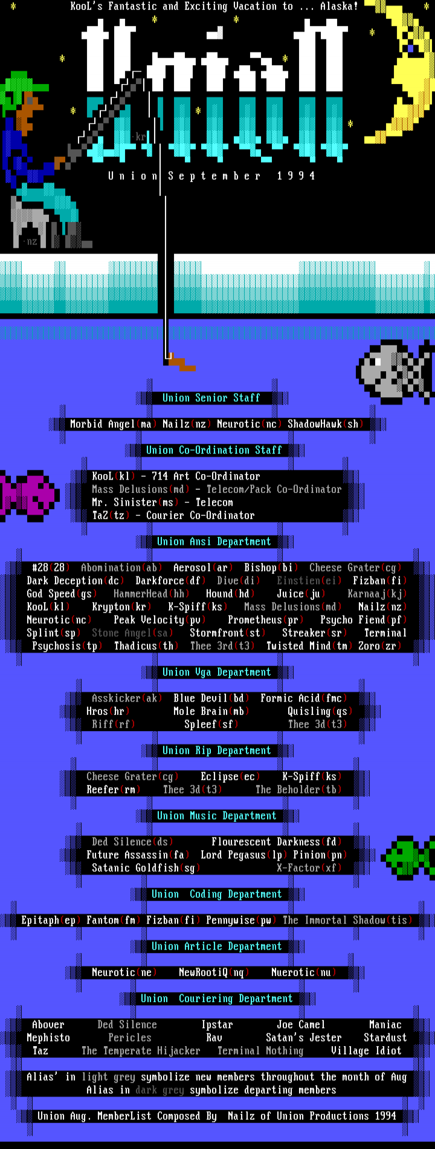 Satanic Goldfishsg X-Factorxf Union Coding Department Epitaphep Fantomfm Fizbanfi Pennywisepw The Immortal Shadowtis Union Article Department Neuroticne NewRootiQnq Nueroticnu Union Couriering Department Abover Ded Silence Ipstar Joe Camel Maniac Mephisto Pericles Rav Satans Jester Stardust Taz The Temperate Hijacker Terminal Nothing Village Idiot Alias in light grey symbolize new members throughout the month of Aug Alias in dark grey symbolize departing members Union Aug. MemberList Composed By Nailz of Union Productions 1994