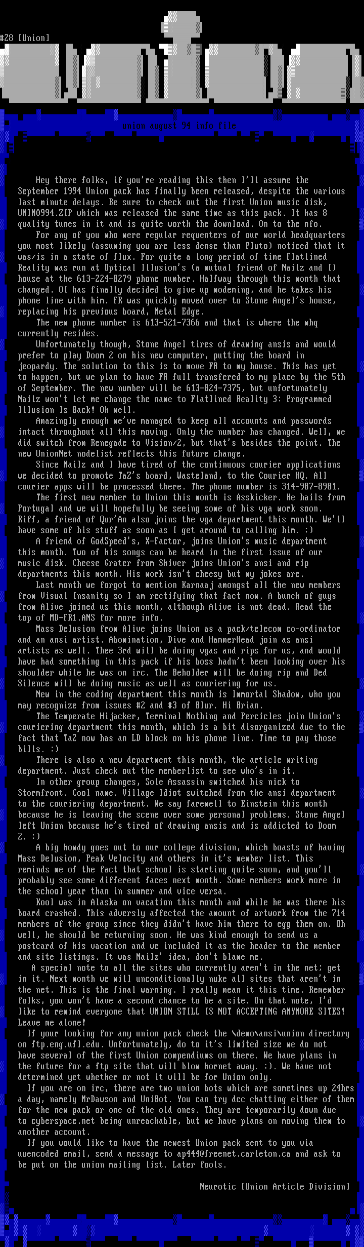 Mass Delusion from Alive joins Union as a pack/telecom co-ordinator and an ansi artist. Abomination, Dive and HammerHead join as ansi artists as well. Thee 3rd will be doing vgas and rips for us, and would have had something in this pack if his boss hadnt been looking over his shoulder while he was on irc. The Beholder will be doing rip and Ded Silence will be doing music as well as couriering for us.