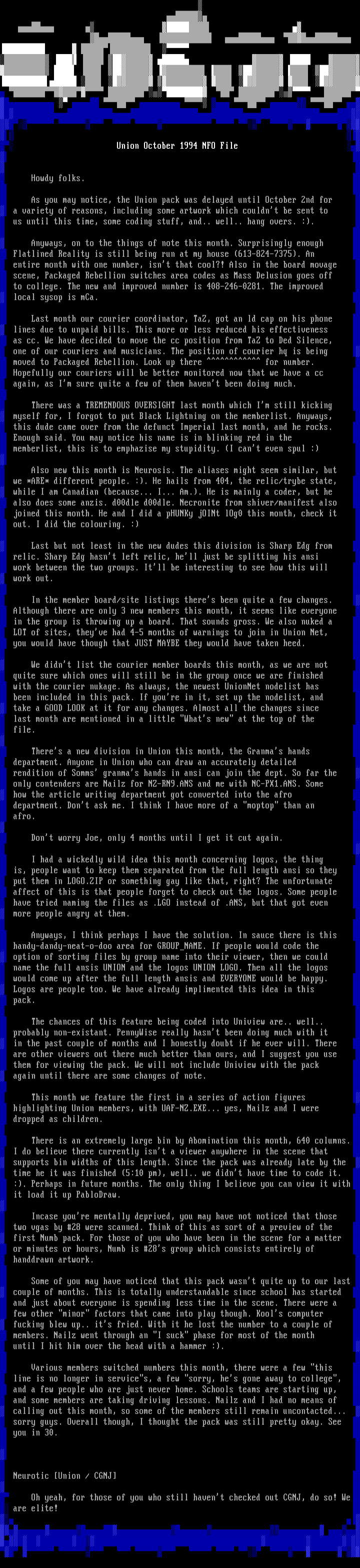 Union October 1994 NFO File Howdy folks. As you may notice, the Union pack was delayed until October 2nd for a variety of reasons, including some artwork which couldnt be sent to us until this time, some coding stuff, and.. well.. hang overs. :. Anyways, on to the things of note this month. Surprisingly enough Flatlined Reality is still being run at my house 613-824-7375. An entire month with one number, isnt that cool?! Also in the board movage scene, Packaged Rebellion switches area codes as Mass Delusion goes off to college. The new and improved number is 408-246-0281. The improved local sysop is mCa. Last month our courier coordinator, TaZ, got an ld cap on his phone lines due to unpaid bills. This more or less reduced his effectiveness as cc. We have decided to move the cc position from TaZ to Ded Silence, one of our couriers and musicians. The position of courier hq is being moved to Packaged Rebellion. Look up there for number. Hopefully our couriers will be better monitored now that we have a cc again, as Im sure quite a few of them havent been doing much. There was a TREMENDOUS OVERSIGHT last month which Im still kicking myself for, I forgot to put Black Lightning on the memberlist. Anyways, this dude came over from the defunct Imperial last month, and he rocks. Enough said. You may notice his name is in blinking red in the memberlist, this is to emphazise my stupidity. I cant even spul : Also new this month is Neurosis. The aliases might seem similar, but we *ARE* different people. :. He hails from 404, the relic/trybe state, while I am Canadian because... I... Am.. He is mainly a coder, but he also does some anzis. d00dle d00dle. Necronite from shiver/manifest also joined this month. He and I did a pHUNKy jOINt lOg0 this month, check it out. I did the colouring. : Last but not least in the new dudes this division is Sharp Edg from relic. Sharp Edg hasnt left relic, hell just be splitting his ansi work between the two groups. Itll be interesting to see how this will work out. In the member board/site listings theres been quite a few changes. Although there are only 3 new members this month, it seems like everyone in the group is throwing up a board. That sounds gross. We also nuked a LOT of sites, theyve had 4-5 months of warnings to join in Union Net, you would have though that JUST MAYBE they would have taken heed. We didnt list the courier member boards this month, as we are not quite sure which ones will still be in the group once we are finished with the courier nukage. As always, the newest UnionNet nodelist has been included in this pack. If youre in it, set up the nodelist, and take a GOOD LOOK at it for any changes. Almost all the changes since last month are mentioned in a little Whats new at the top of the file. Theres a new division in Union this month, the Granmas hands department. Anyone in Union who can draw an accurately detailed rendition of Somms granmas hands in ansi can join the dept. So far the only contenders are Nailz for NZ-RN9.ANS and me with NC-PX1.ANS. Some how the article writing department got converted into the afro department. Dont ask me. I think I have more of a moptop than an afro. Dont worry Joe, only 4 months until I get it cut again. I had a wickedly wild idea this month concerning logos, the thing is, people want to keep them separated from the full length ansi so they put them in LOGO.ZIP or something gay like that, right? The unfortunate affect of this is that people forget to check out the logos. Some people have tried naming the files as .LGO instead of .ANS, but that got even more people angry at them. Anyways, I think perhaps I have the solution. In sauce there is this handy-dandy-neat-o-doo area for GROUPNAME. If people would code the option of sorting files by group name into their viewer, then we could name the full ansis UNION and the logos UNION LOGO. Then all the logos would come up after the full length ansis and EVERYONE would be happy. Logos are people too. We have already implimented this idea in this pack. The chances of this feature being coded into Uniview are.. well.. probably non-existant. PennyWise really hasnt been doing much with it in the past couple of months and I honestly doubt if he ever will. There are other viewers out there much better than ours, and I suggest you use them for viewing the pack. We will not include Uniview with the pack again until there are some changes of note. This month we feature the first in a series of action figures highlighting Union members, with UAF-NZ.EXE... yes, Nailz and I were dropped as children. There is an extremely large bin by Abomination this month, 640 columns. I do believe there currently isnt a viewer anywhere in the scene that supports bin widths of this length. Since the pack was already late by the time he it was finished 5:10 pm, well.. we didnt have time to code it. :. Perhaps in future months. The only thing I believe you can view it with it load it up PabloDraw. Incase youre mentally deprived, you may have not noticed that those two vgas by 28 were scanned. Think of this as sort of a preview of the first Numb pack. For those of you who have been in the scene for a matter or minutes or hours, Numb is 28s group which consists entirely of handdrawn artwork. Some of you may have noticed that this pack wasnt quite up to our last couple of months. This is totally understandable since school has started and just about everyone is spending less time in the scene. There were a few other minor factors that came into play though. Kools computer fucking blew up.. its fried. With it he lost the number to a couple of members. Nailz went through an I suck phase for most of the month until I hit him over the head with a hammer :. Various members switched numbers this month, there were a few this line is no longer in services, a few sorry, hes gone away to college, and a few people who are just never home. Schools teams are starting up, and some members are taking driving lessons
