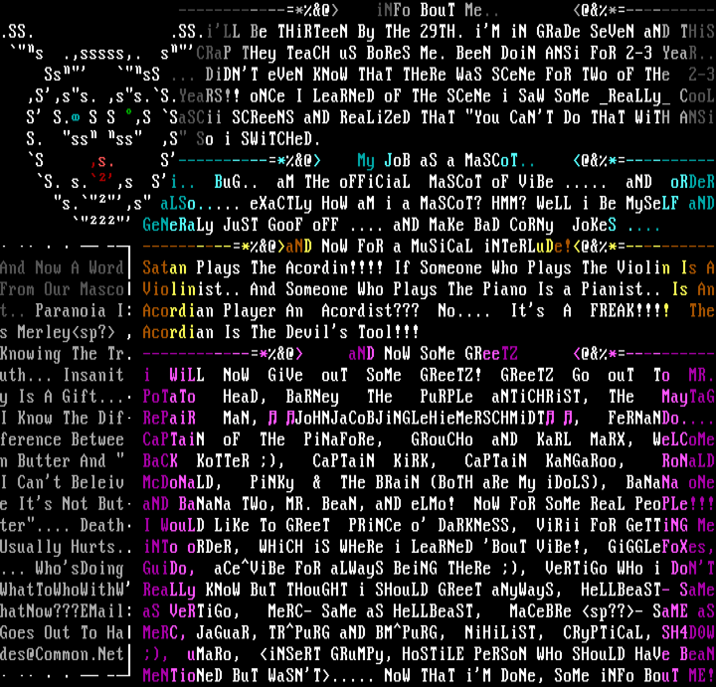 ------------*@ iNFo BouT Me.. @*----------.SS. .SS.iLL Be THiRTeeN By THe 29TH. iM iN GRaDe SeVeN aND THiS s .,sssss,. sCRaP THey TeaCH uS BoReS Me. BeeN DoiN ANSi FoR 2-3 YeaR.. Ss sS ... DiDNT eVeN KNoW THaT THeRe WaS SCeNe FoR TWo oF THe 2-3 ,S,ss. ,ss.S.YeaRS!! oNCe I LeaRNeD oF THe SCeNe i SaW SoMe ReaLLy CooL S S. S S ,S SaSCii SCReeNS aND ReaLiZeD THaT You CaNT Do THaT WiTH ANSi S. ss ss ,S So i SWiTCHeD.