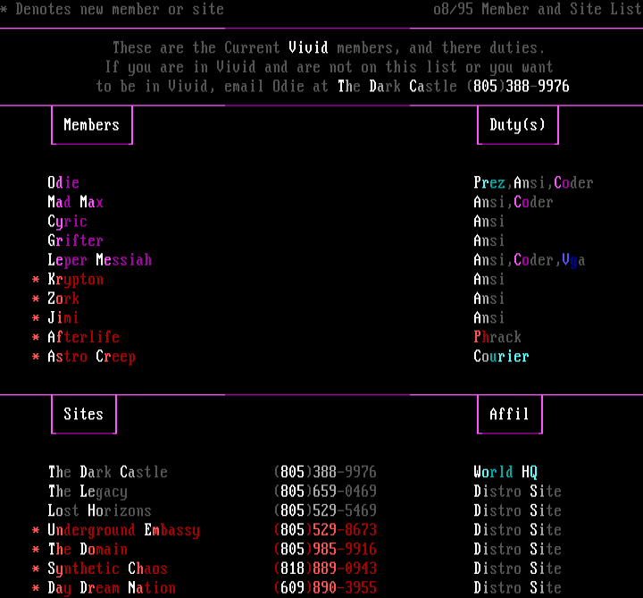 * Denotes new member or site o8/95 Member and Site List These are the Current Vivid members, and there duties.