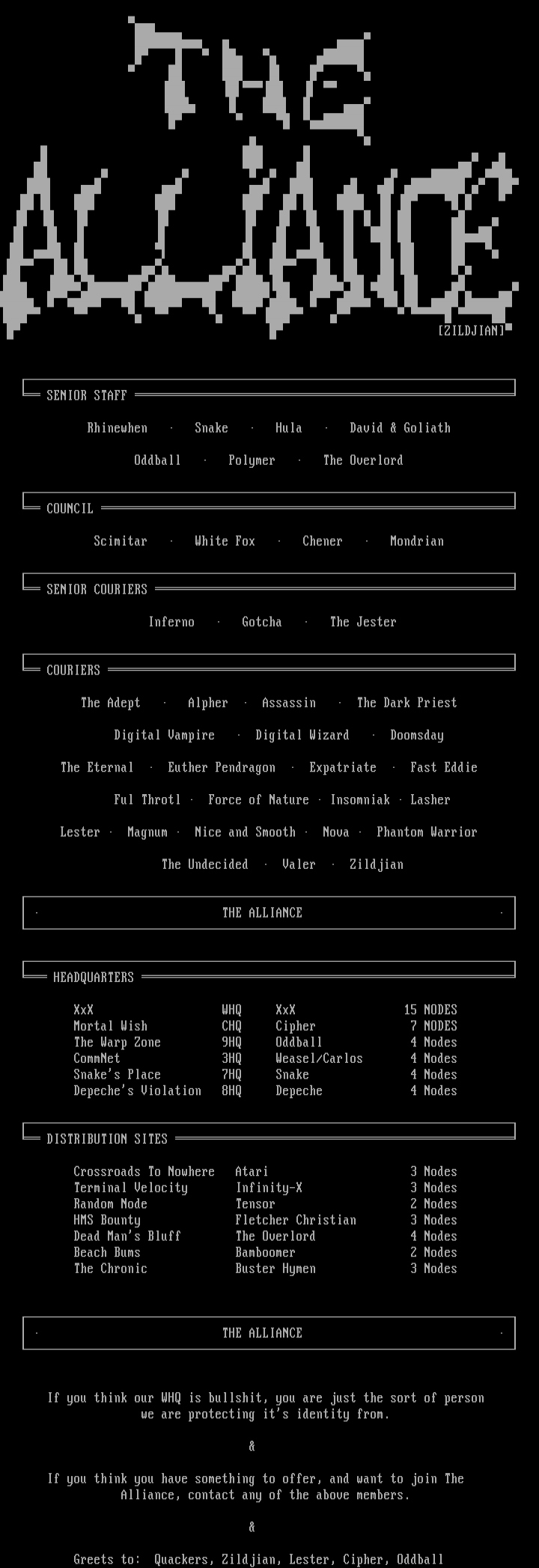 Greets to: Quackers, Zildjian, Lester, Cipher, Oddball