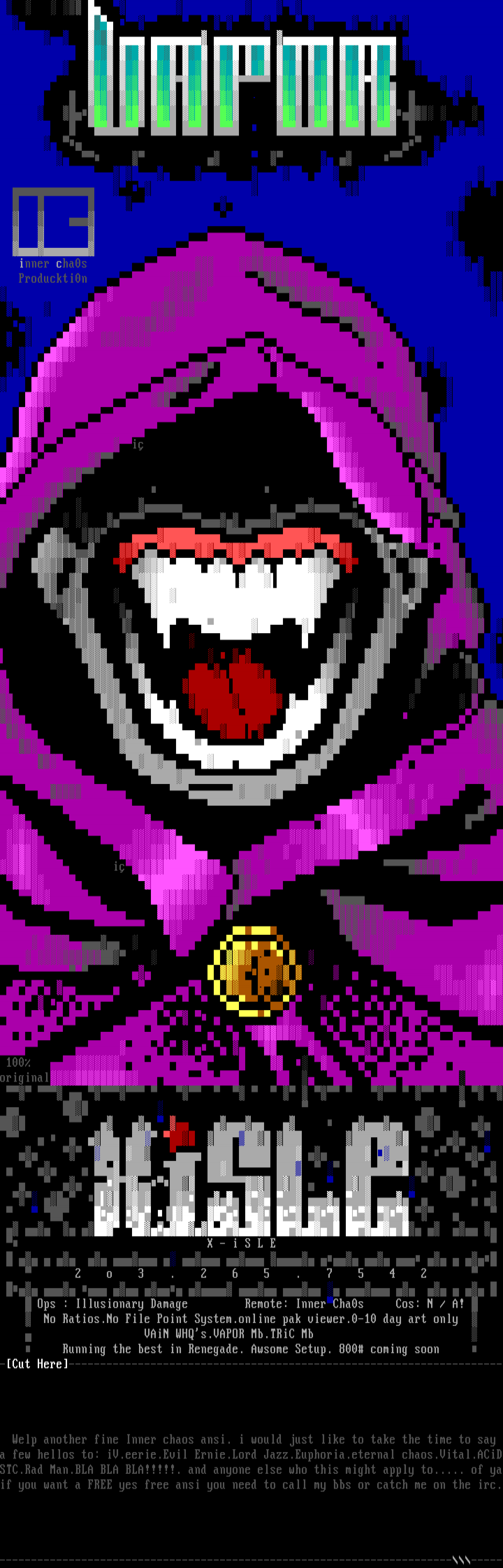 a few hellos to: iV.eerie.Evil Ernie.Lord Jazz.Euphoria.eternal chaos.Vital.ACiDSTC.Rad Man.BLA BLA BLA!!!!!. and anyone else who this might apply to..... of yaif you want a FREE yes free ansi you need to call my bbs or catch me on the irc.