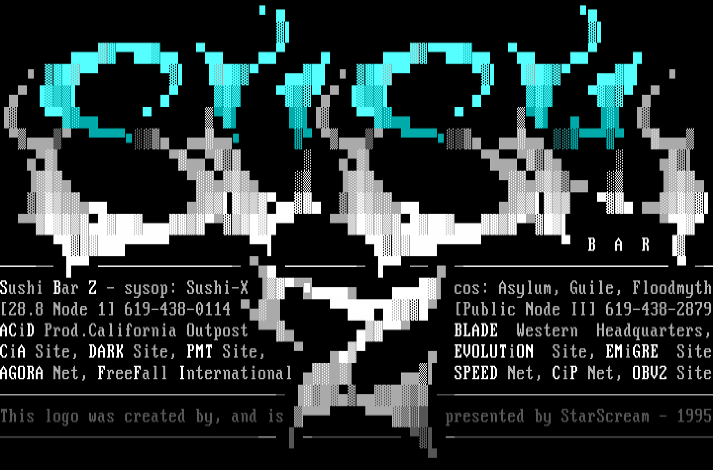 Sushi Bar Z - sysop: Sushi-X cos: Asylum, Guile, Floodmyth28.8 Node 1 619-438-0114 Public Node II 619-438-2879ACiD Prod.California Outpost BLADE Western Headquarters,CiA Site, DARK Site, PMT Site, EVOLUTiON Site, EMiGRE SiteAGORA Net, FreeFall International SPEED Net, CiP Net, OBV2 Site This logo was created by, and is presented by StarScream - 1995
