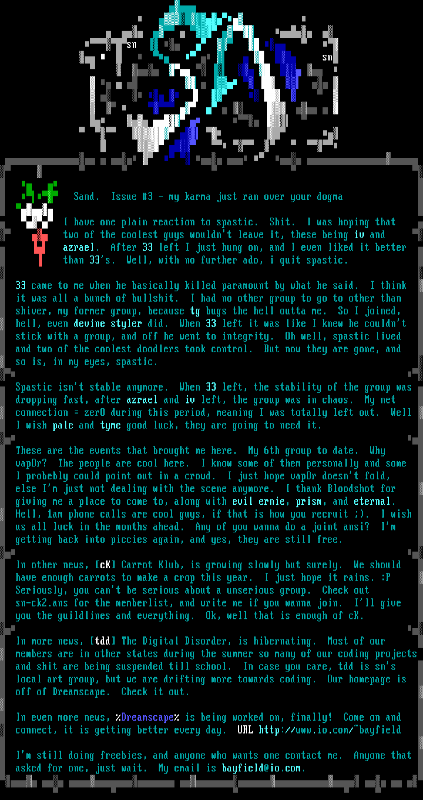 Seriously, you cant be serious about a unserious group. Check out sn-ck2.ans for the memberlist, and write me if you wanna join. Ill give you the guildlines and everything. Ok, well that is enough of cK. In more news, tdd The Digital Disorder, is hibernating. Most of our members are in other states during the summer so many of our coding projects