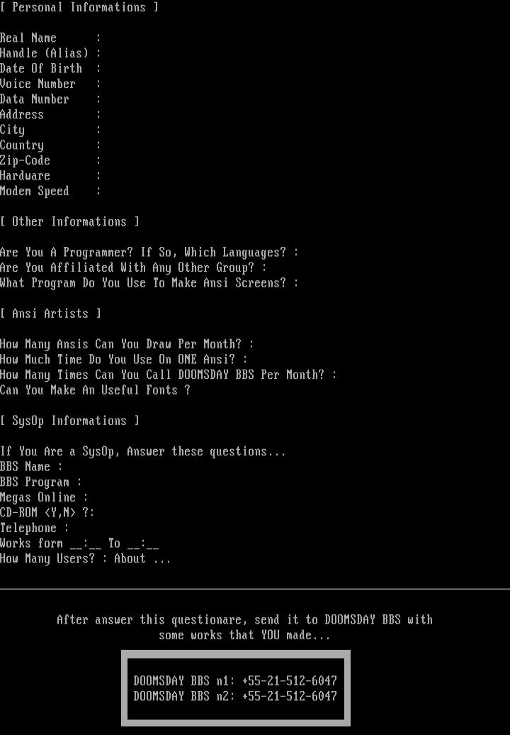 DOOMSDAY BBS n1: +55-21-512-6047