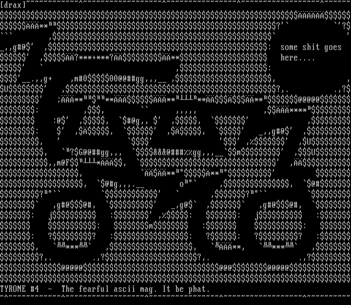 .,,g+ ,m000@@gg,,, ,, ,U ,?,. .,? **********@@@@@: ,, ,,,,, ,**** :@ ,, @g,, ,, ,: ,, ,, ,,g@ ,, , ,U, ?G@@gg,,, @gg,,,m ,U,,m@F*, ,, **** , @g,,,. o ,, @? ,? ,g@@, ,g@ , ,g@@, : j : ,: : j : : m : : : ?? :: ?: ?? :, *** ,, **, *** ,?,. .,??,. .,?@@@@@@@@@@@@@TYRONE 4 - The fearful ascii mag. It be phat.