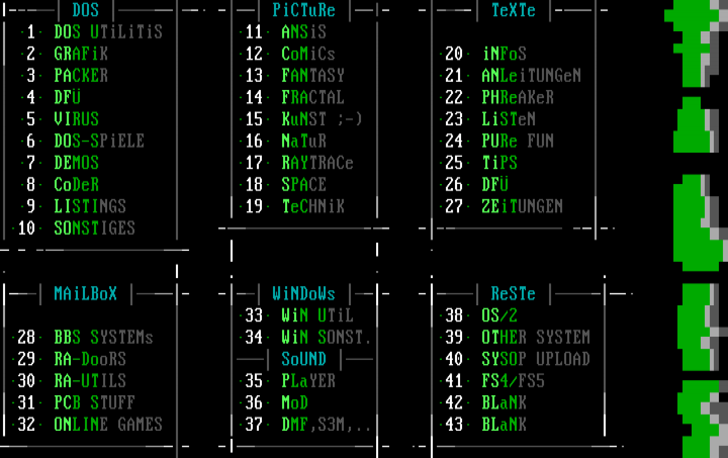 -- DOS - - PiCTuRe - -- TeXTe -- 1 DOS UTiLiTiS 11 ANSiS 2 GRAFiK 12 CoMiCs 20 iNFoS