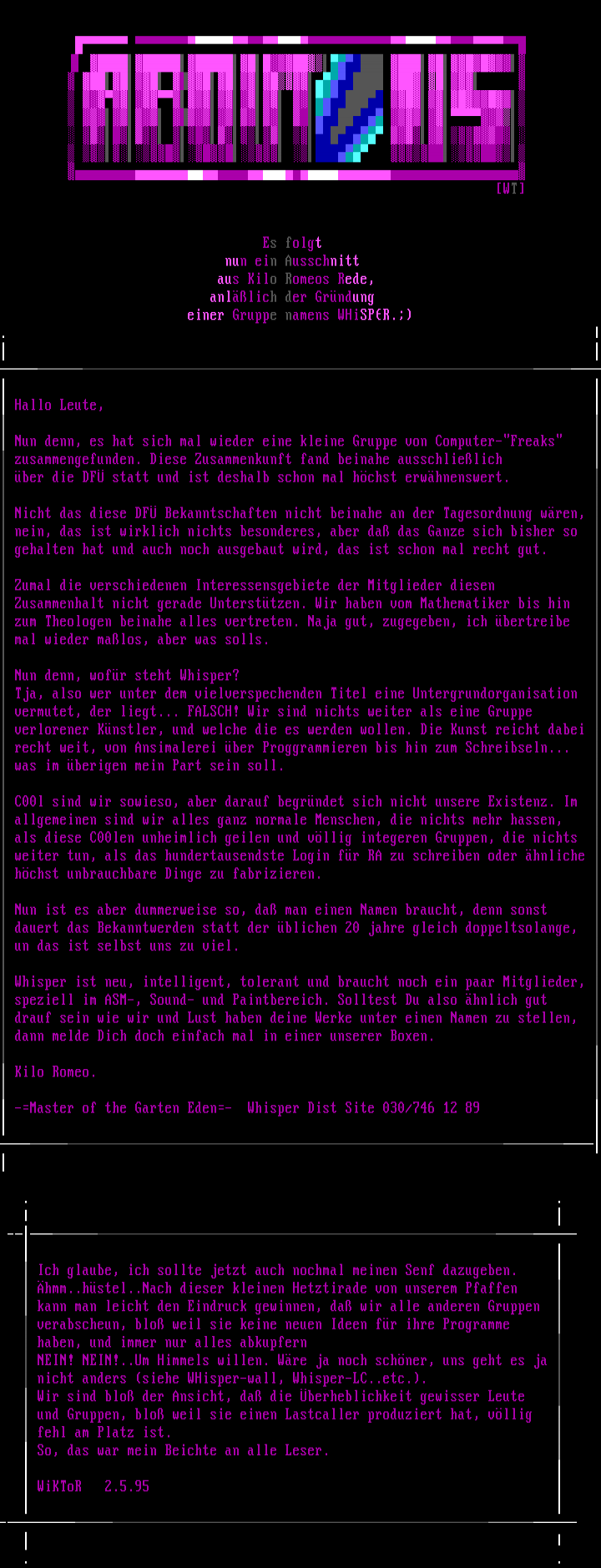 einer Gruppe namens WHiSPR. . Hallo Leute, Nun denn, es hat sich mal wieder eine kleine Gruppe von Computer-Freaks zusammengefunden. Diese Zusammenkunft fand beinahe ausschlielich ber die DF statt und ist deshalb schon mal hchst erwhnenswert. Nicht das diese DF Bekanntschaften nicht beinahe an der Tagesordnung wren, nein, das ist wirklich nichts besonderes, aber da das Ganze sich bisher so gehalten hat und auch noch ausgebaut wird, das ist schon mal recht gut. Zumal die verschiedenen Interessensgebiete der Mitglieder diesen Zusammenhalt nicht gerade Untersttzen. Wir haben vom Mathematiker bis hin zum Theologen beinahe alles vertreten. Naja gut, zugegeben, ich bertreibe mal wieder malos, aber was solls. Nun denn, wofr steht Whisper? Tja, also wer unter dem vielverspechenden Titel eine Untergrundorganisation vermutet, der liegt... FALSCH! Wir sind nichts weiter als eine Gruppe verlorener Knstler, und welche die es werden wollen. Die Kunst reicht dabei recht weit, von Ansimalerei ber Proggrammieren bis hin zum Schreibseln... was im berigen mein Part sein soll. C00l sind wir sowieso, aber darauf begrndet sich nicht unsere Existenz. Im allgemeinen sind wir alles ganz normale Menschen, die nichts mehr hassen, als diese C00len unheimlich geilen und vllig integeren Gruppen, die nichts weiter tun, als das hundertausendste Login fr RA zu schreiben oder hnliche hchst unbrauchbare Dinge zu fabrizieren. Nun ist es aber dummerweise so, da man einen Namen braucht, denn sonst dauert das Bekanntwerden statt der blichen 20 jahre gleich doppeltsolange, un das ist selbst uns zu viel. Whisper ist neu, intelligent, tolerant und braucht noch ein paar Mitglieder, speziell im ASM-, Sound- und Paintbereich. Solltest Du also hnlich gut drauf sein wie wir und Lust haben deine Werke unter einen Namen zu stellen, dann melde Dich doch einfach mal in einer unserer Boxen. Kilo Romeo. -Master of the Garten Eden- Whisper Dist Site 030/746 12 89
