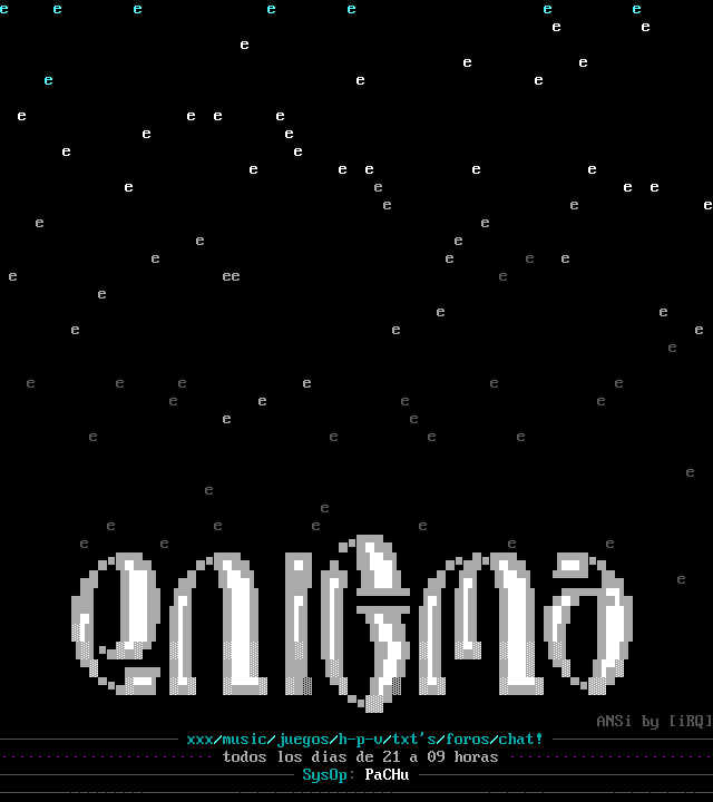 ANSi by iRQ xxx/music/juegos/h-p-v/txts/foros/chat! todos los dias de 21 a 09 horas SysOp: PaCHu ----------------------------------