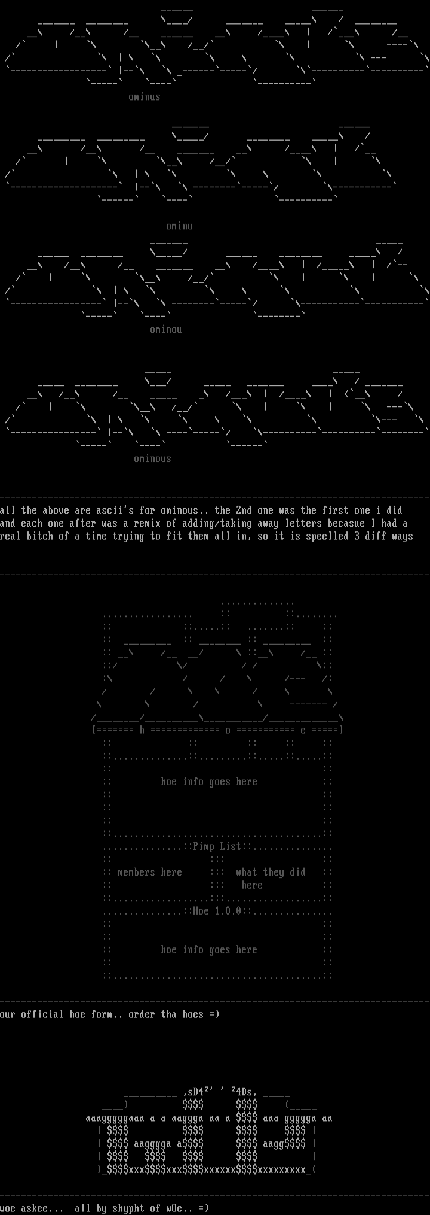 --------------------------------------------------------------------------------all the above are asciis for ominous.. the 2nd one was the first one i did