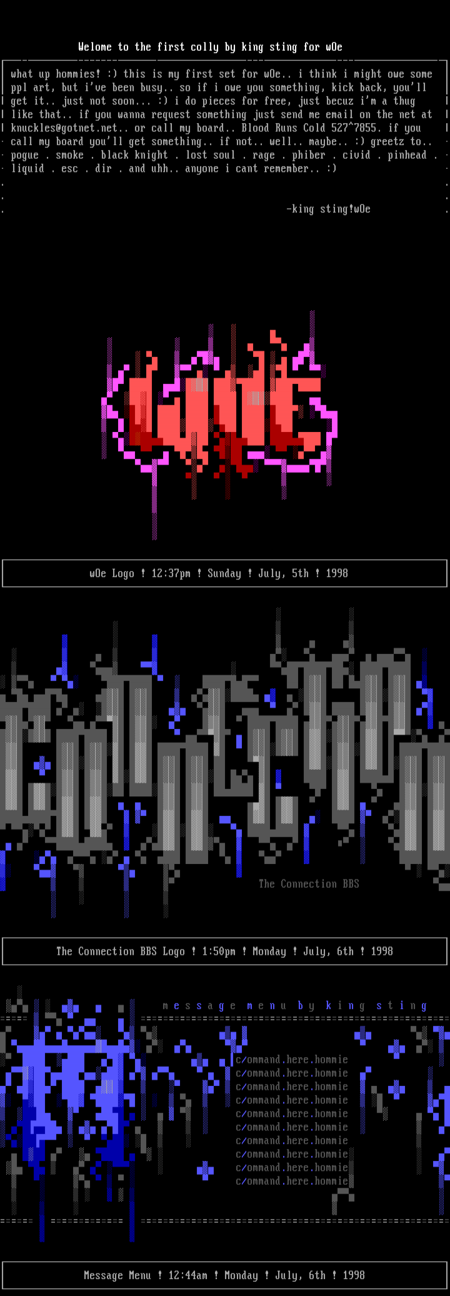 -------------------- what up hommies! : this is my first set for wOe.. i think i might owe some ppl art, but ive been busy.. so if i owe you something, kick back, youll get it.. just not soon... : i do pieces for free, just becuz im a thug like that.. if you wanna request something just send me email on the net at knuckles@gotnet.net.. or call my board.. Blood Runs Cold 5277855. if you call my board youll get something.. if not.. well.. maybe.. : greetz to.. pogue . smoke . black knight . lost soul . rage . phiber . civid . pinhead . liquid . esc . dir . and uhh.. anyone i cant remember.. : . .. .. -king sting!wOe .