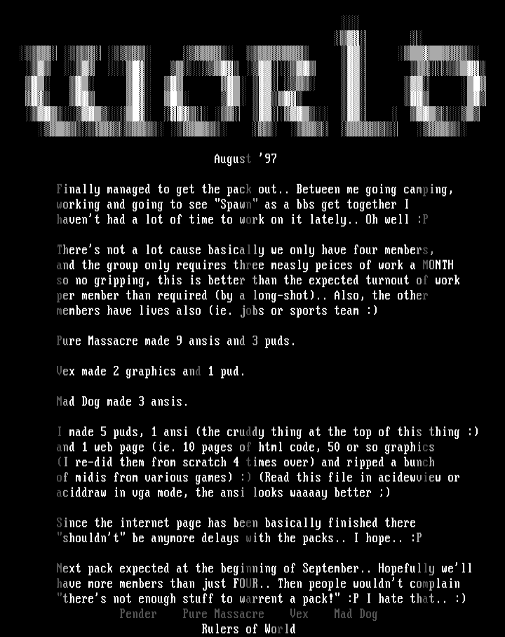 August97Finallymanagedtogetthepackout..Betweenmegoingcamping,workingandgoingtoseeSpawnasabbsgettogetherIhaventhadalotoftimetoworkonitlately..Ohwell:PTheresnotalotcausebasicallyweonlyhavefourmembers,andthegrouponlyrequiresthreemeaslypeicesofworkaMONTHsonogripping,thisisbetterthantheexpectedturnoutofworkpermemberthanrequiredbyalong-shot..Also,theothermembershavelivesalsoie.jobsorsportsteam:PureMassacremade9ansisand3puds.Vexmade2graphicsand1pud.MadDogmade3ansis.Imade5puds,1ansithecruddythingatthetopofthisthing:and1webpageie.10pagesofhtmlcode,50orsographicsIre-didthemfromscratch4timesoverandrippedabunchofmidisfromvariousgames:Readthisfileinacidewvieworaciddrawinvgamode,theansilookswaaaaybetterSincetheinternetpagehasbeenbasicallyfinishedthereshouldntbeanymoredelayswiththepacks..Ihope..:PNextpackexpectedatthebeginningofSeptember..HopefullywellhavemoremembersthanjustFOUR..Thenpeoplewouldntcomplaintheresnotenoughstufftowarrentapack!:PIhatethat..:Pender PureMassacre Vex MadDogRulersofWorld