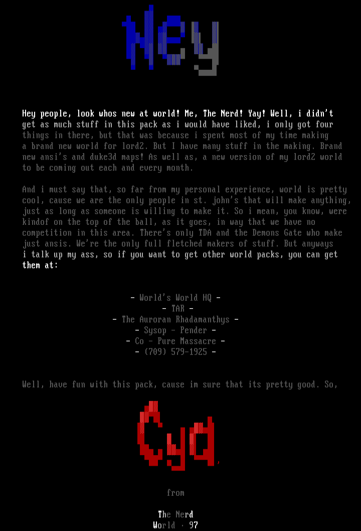a brand new world for lord2.But Ihave many stuff in themaking. Brand new ansis and duke3d maps! As well as, a new version ofmy lord2 world tobecoming out each and every month.