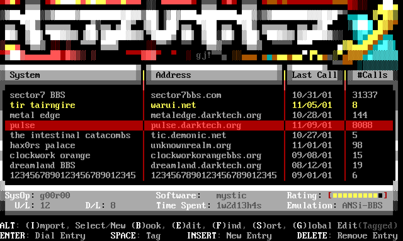 U/L: 12 D/L: 8 Time Spent: 1w2d13h4s Emulation: ANSi-BBS