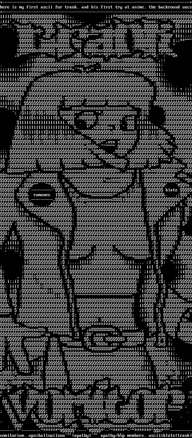 +------------------------------------------------------------------------------+here is my first ascii for trank. and his first try at anime. the backround sucs+------------------------------------------------------------------------------+lllllli,. iSSiii,lSSSSlii,. .,il Ss.,. Sssss.,Y Sssss..s.i.,s, .,L sSSs. Ys lllll !sS+ SsSLSssSs PsSS sllliiii s,l ,Y ! llYP lii SsssS Sss.,sssS , l . Y ,
