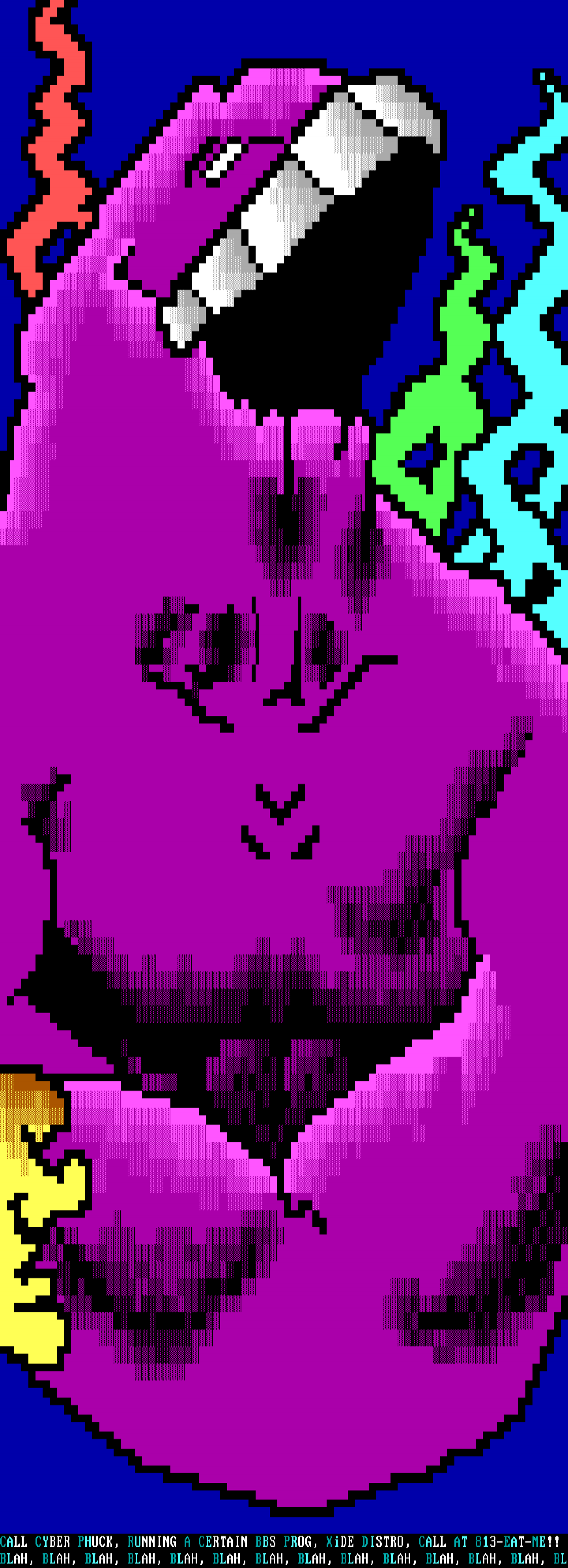 CALL CYBER PHUCK, RUNNING A CERTAIN BBS PROG, XiDE DISTRO, CALL AT 813-EAT-ME!!