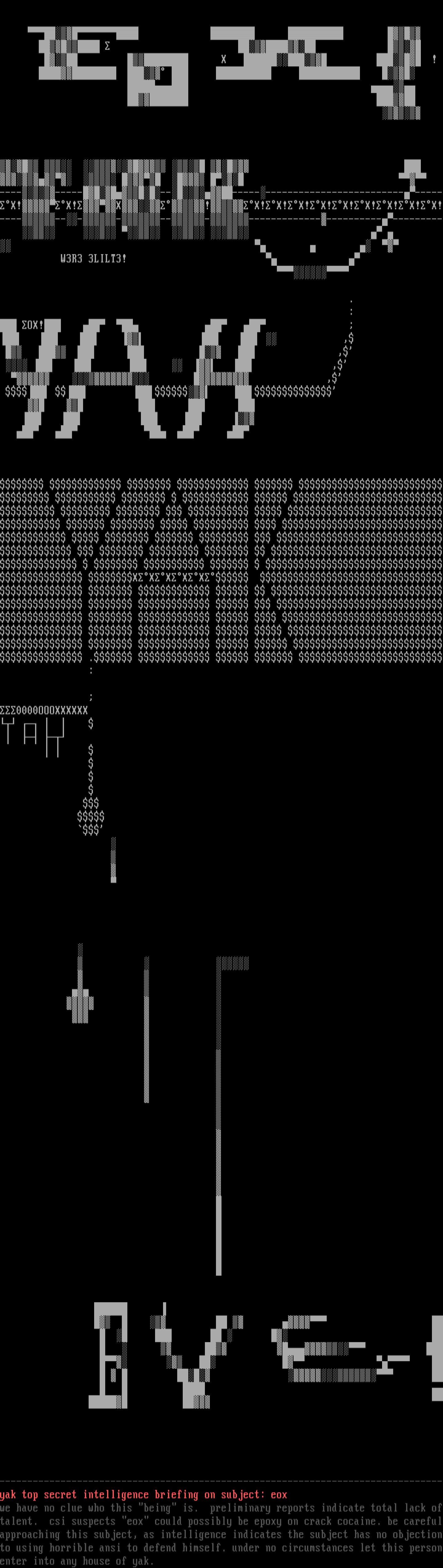 we have no clue who this being is. preliminary reports indicate total lack oftalent. csi suspects eox could possibly be epoxy on crack cocaine. be carefulapproaching this subject, as intelligence indicates the subject has no objectionto using horrible ansi to defend himself. under no circumstances let this personenter into any house of yak.