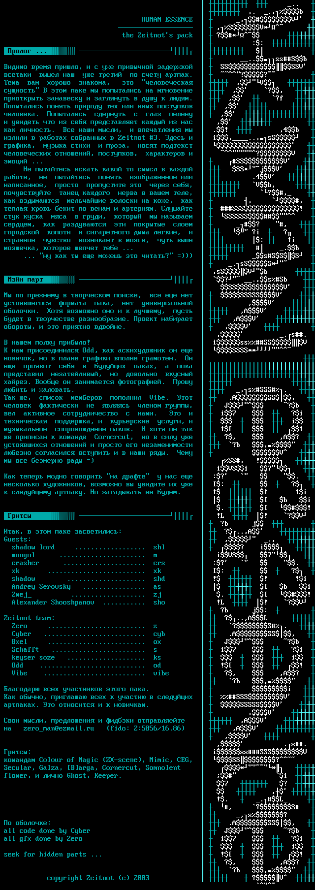 .. ,. .,b HUMAN ESSENCE ,V ,SV* the Zeitnots pack ?* :: ... ..ssSb , SSSSV . ?? , ,V , ?, . , ?f , . , , . , .! ,4b Zeitnot 3. i,..,sS , , , , ?V ... SSV SS*jV , .4V , , Vb, , ?, , , , . SSS! , SSSSSS , ? , , ?i ? , : !i , ... .b ... ? sSSS .sSS* ,sSVb ? .,sSb SSV , SSSSSV , ,V . , ,AV . ,AV , . ,V , .s. ! issSSV Odd, SSSS** , . , , . . . ,sSSS. , Vibe. .ASS, , J ?b . i7 ?i , , i . ! ! Cornercut, ?, ,A? ?b , . V SS, ! iVSi 7 :? . , I: ? . . ! ! !i I b i . I ! !L ! ?V ?b j , : ?..,A Guests: , ., shadow lord .................. shl ? i mongol ...................... m iVS 7 crasher ..................... crs :? . xk ......................... xk I: ? shadow .................... shd ! ! !i Andrey Serovsky ................ as I b i Zmej ................... zj . I ! Alexander Shooshpanov ........... sho !L ! ?V ?b j: Zeitnot team: ?..,AL Zero ......................... z ?S. Cyber .......................... cyb .ASS, 0xel ......................... ox J ?b Schafft ........................ s i7 ?i keyser soze .................... ks i Odd ........................... od ! ! Vibe .......................... vibe ?, ,A? ?b , . i , SSSV . . SSSSSV ,V , ,AV zeroman@ezmail.ru fido: 2:5056/16.86 ,AV ,V , .s. : issSSSV Colour of Magic ZX-scene, Mimic, CEG, SS?