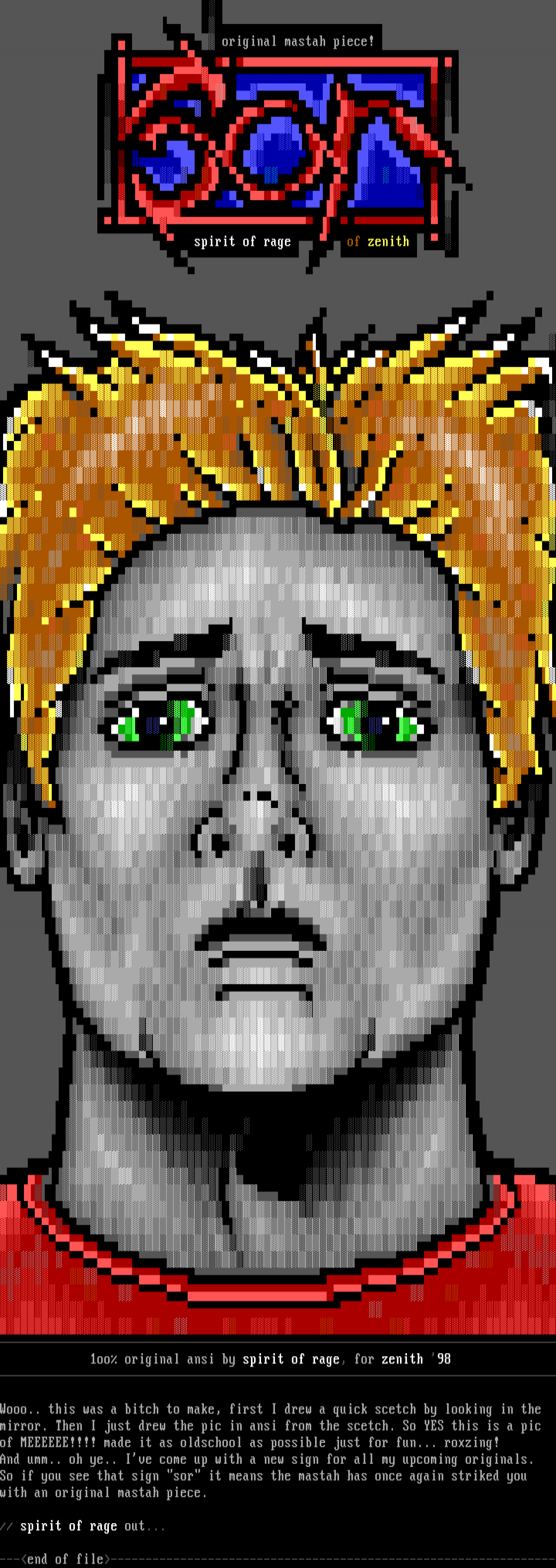mirror. Then I just drew the pic in ansi from the scetch. So YES this is a pic of MEEEEEE!!!! made it as oldschool as possible just for fun... roxzing!