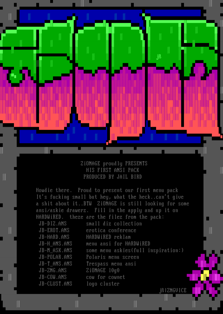 PRODUCED BY JAIL BIRD Howdie there. Proud to present our first menu pack Its fucking small but hey, what the heck..cant give a shit about it..BTW ZiONAGE is still looking for some ansi/askie drawerz. Fill in the apply and up it on HARDWiRED. theze are the filez from the pack: JB-DIZ.ANS small diz collection JB-EROT.ANS erotica conference JB-HARD.ANS HARDWiRED reklam JB-HANS.ANS menu ansi for HARDWiRED JB-MASK.ANS some menu askiesfull inspiration: JB-POLAR.ANS Polaris menu screen JB-TANS.ANS Trespass menu ansi JB-ZNG.ANS ZiONAGE l0g0 JB-COW.ANS cow for cownet JB-CLUST.ANS logo cluster jZNGVICE